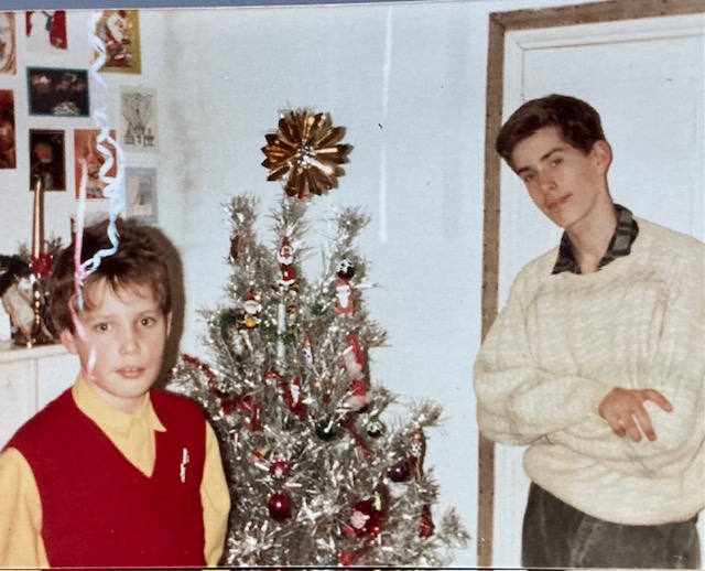 This assembly process was carried out every year by myself and my brother, and was hugely enjoyable. It had all the pleasure of a kit of Lego or Airfix, but with none of the butchness. The tree was sustainable in the current sense, too, lasting our entire childhoods. Here’s me and my brother with the tree in Suffolk, during the mid-1980s: